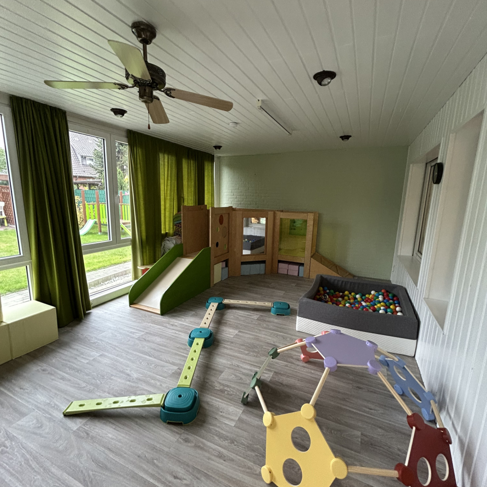 Der große helle Gruppenraum bietet viel Platz für verschiedene Spiel, Mal und Bastelmöglichkeiten. Direkt daneben liegt der lichtdurchflutete beheizte Wintergarten der uns als Aktions und Turnraum dient. Hier steht eine große Spielebene, sowie ein Bällebad, Balancierspiele und andere Gegenstände zur Verfügung.