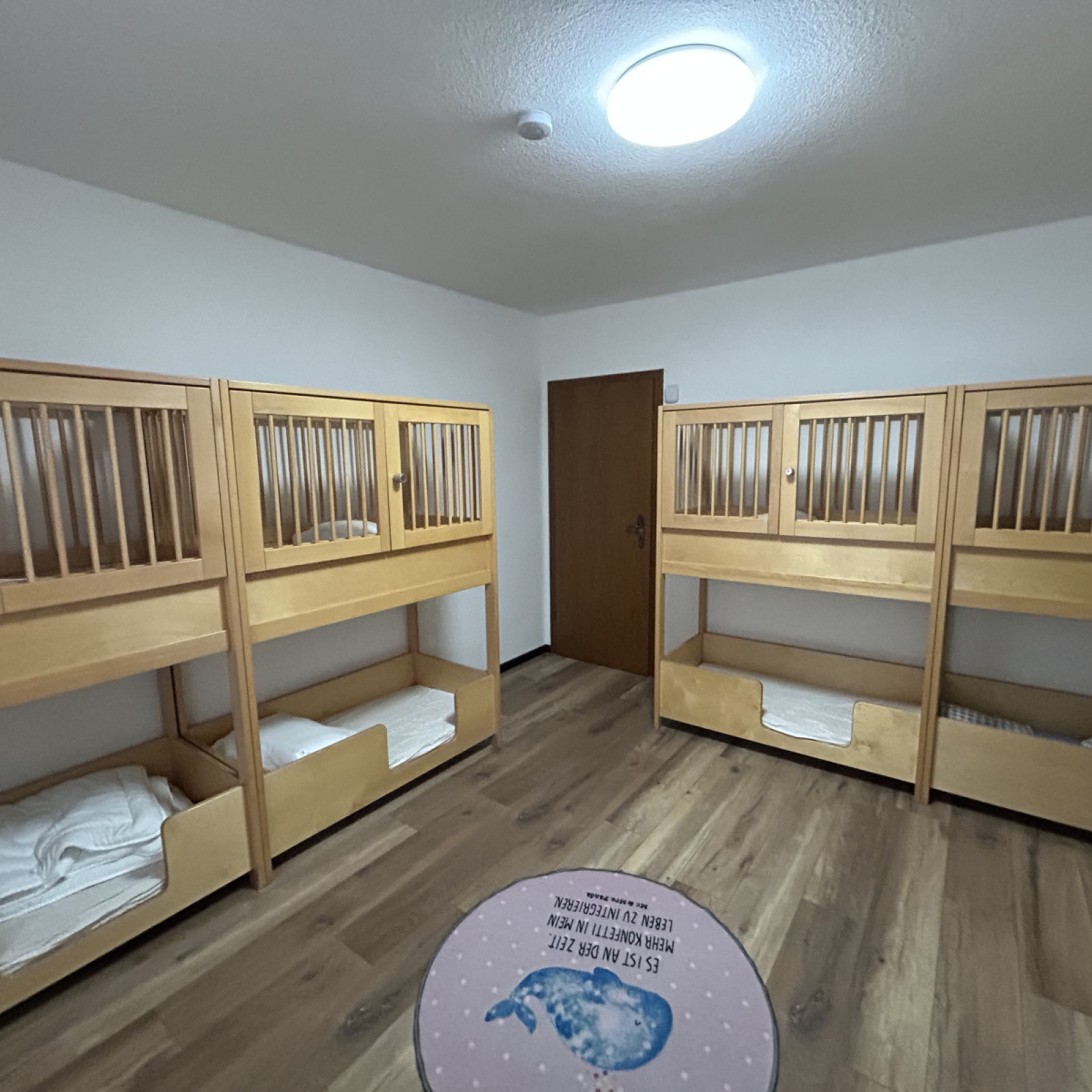 Für den Mittagsschlaf oder um sich auszuruhen, gibt es einen seperaten Schlafraum, wo jedes Kind sein eigenes Bett hat.